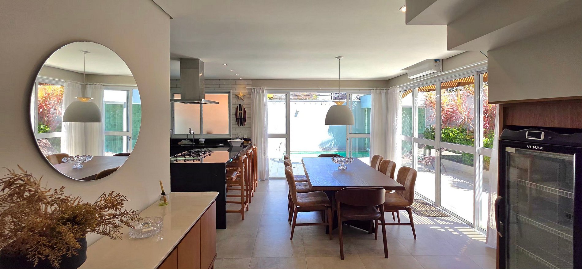 A copa conta com uma elegante mesa para 8 pessoas com poltronas de couro, ideal para refeições em família.