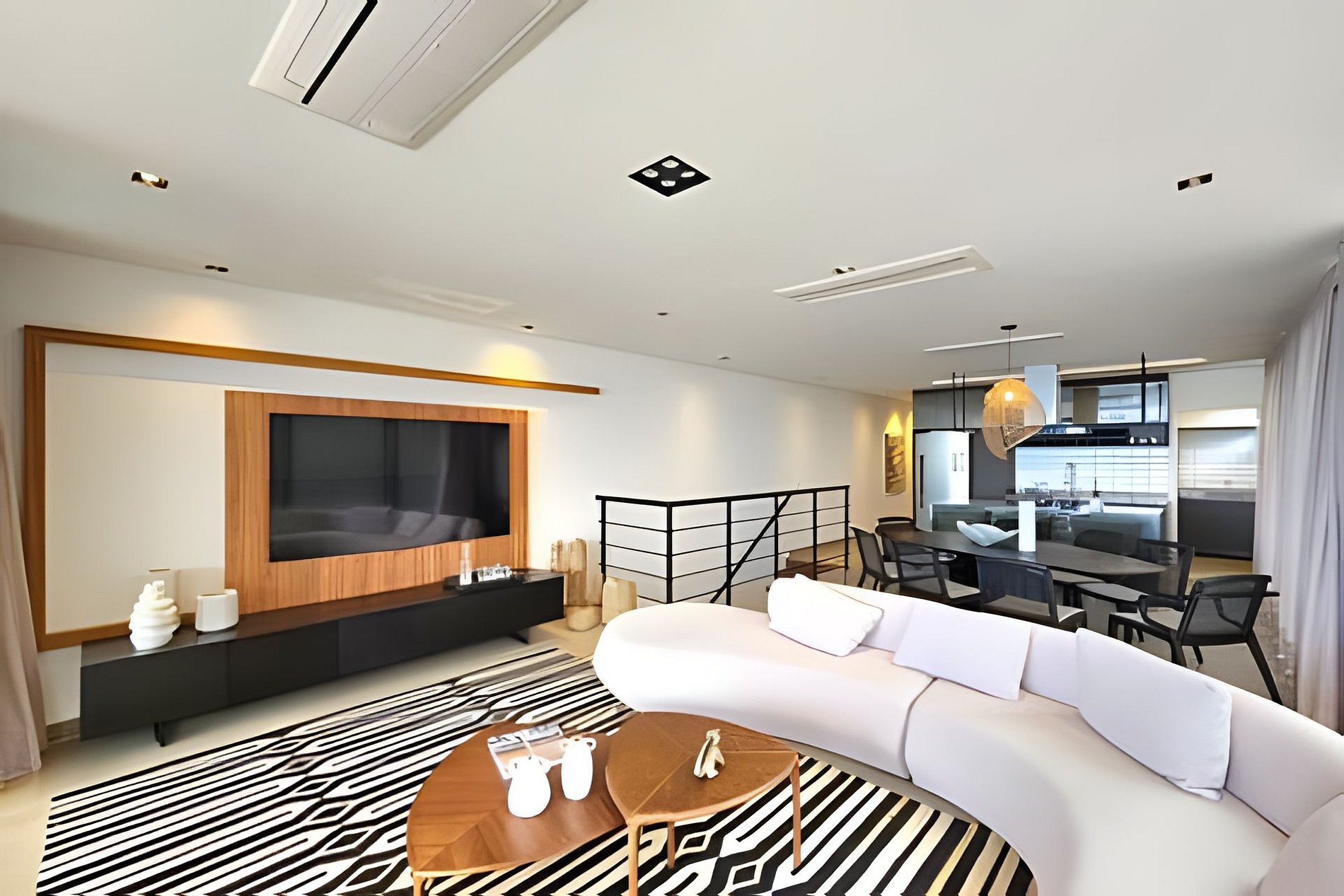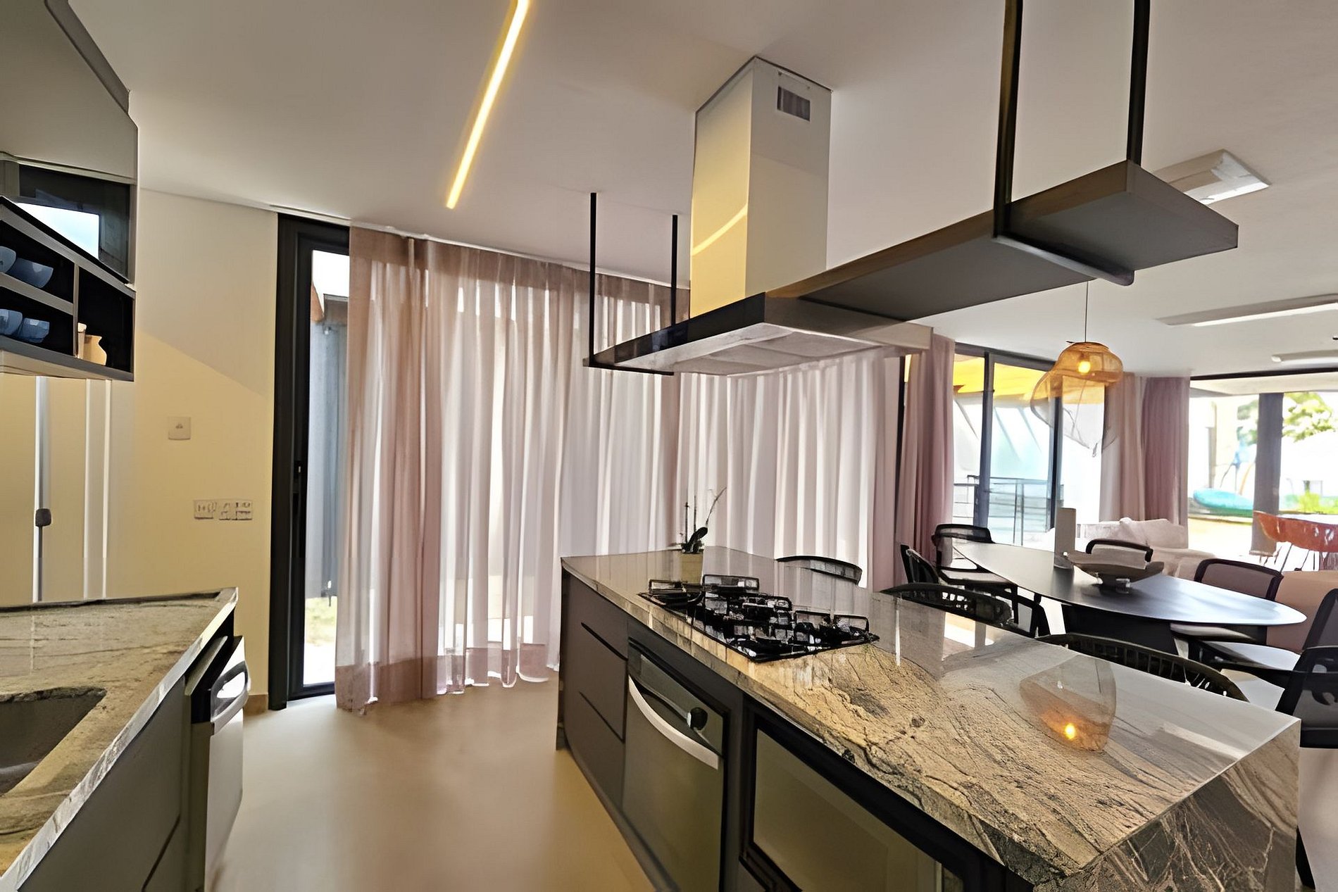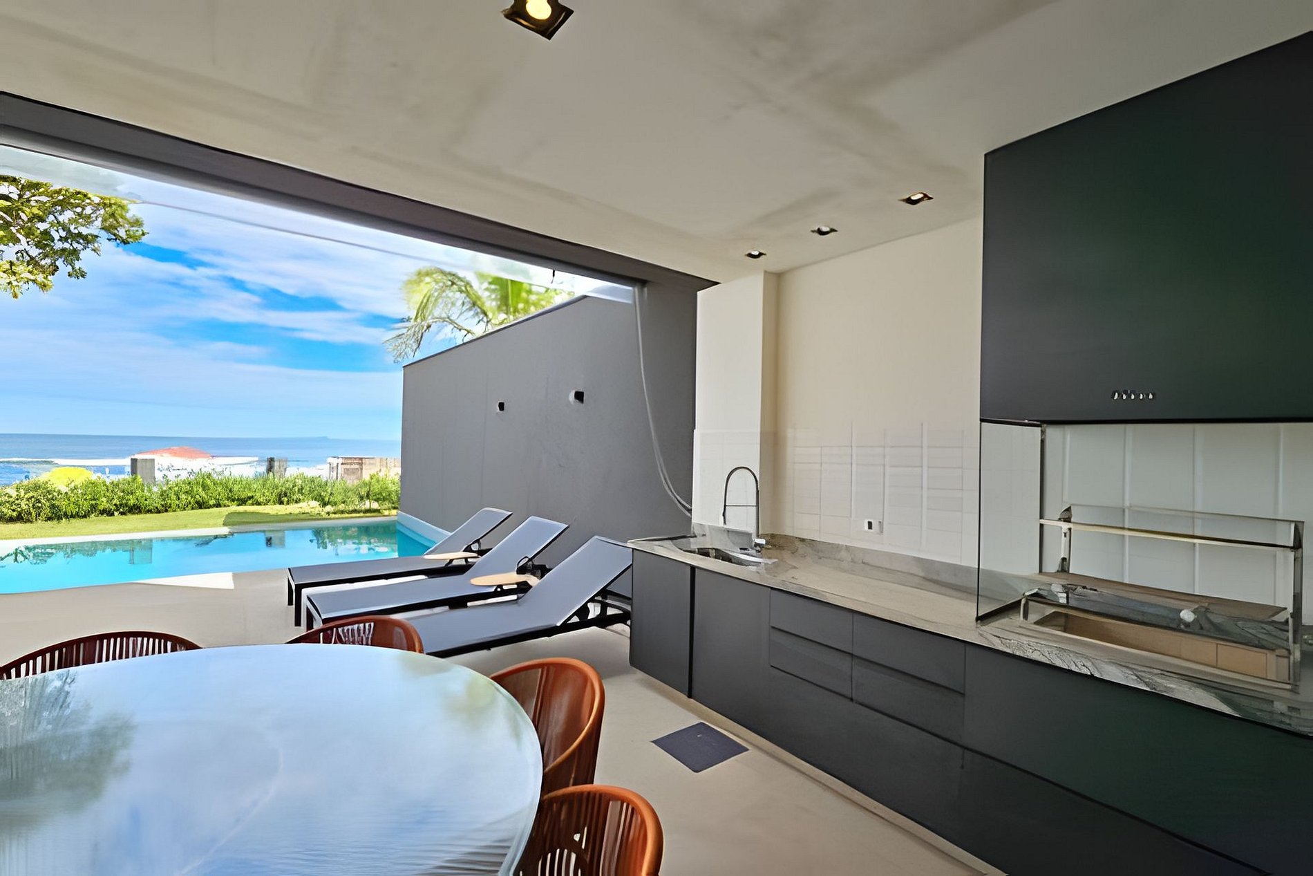 A sala de TV é integrada com a varanda gourmet e a piscina, criando um ambiente perfeito para relaxar e socializar. Aproveite o chuveirão com vista para o mar após um dia de praia.