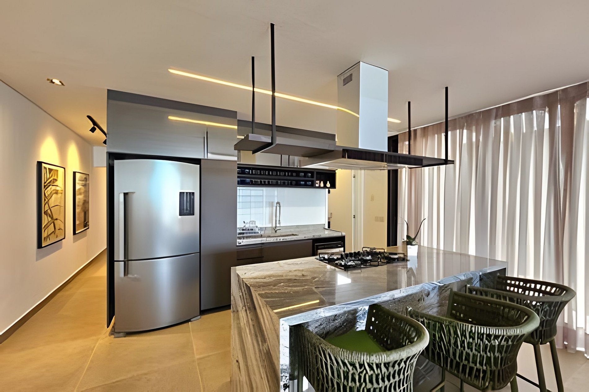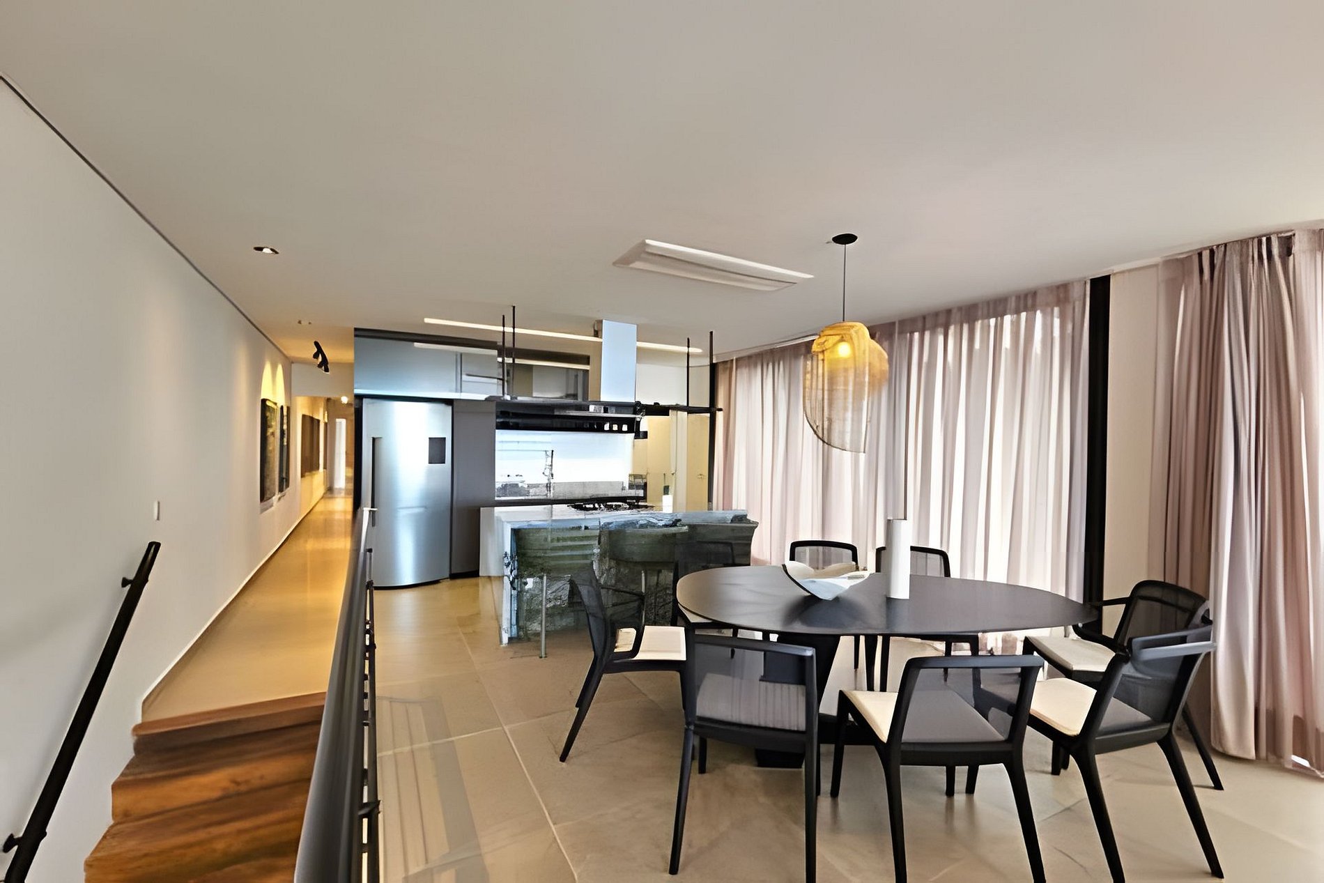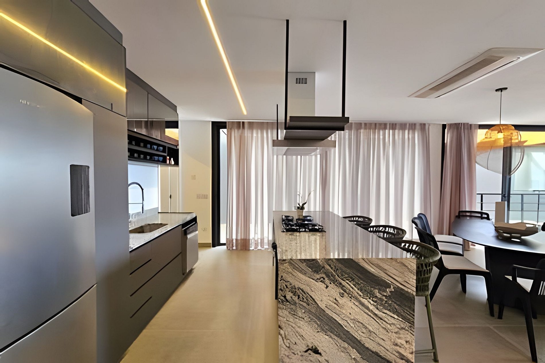 A sala de TV é integrada com a varanda gourmet e a piscina, criando um ambiente perfeito para relaxar e socializar. Aproveite o chuveirão com vista para o mar após um dia de praia.