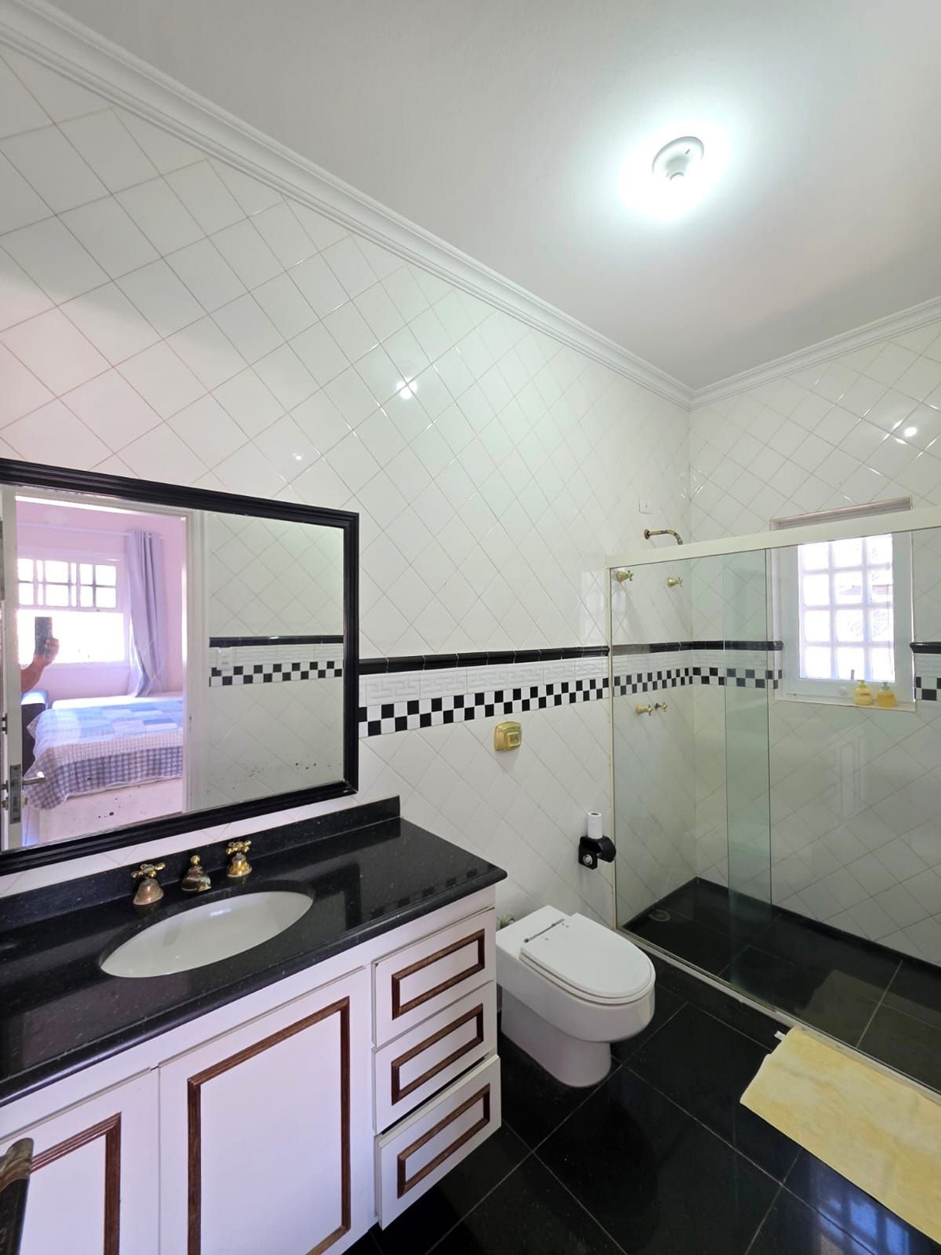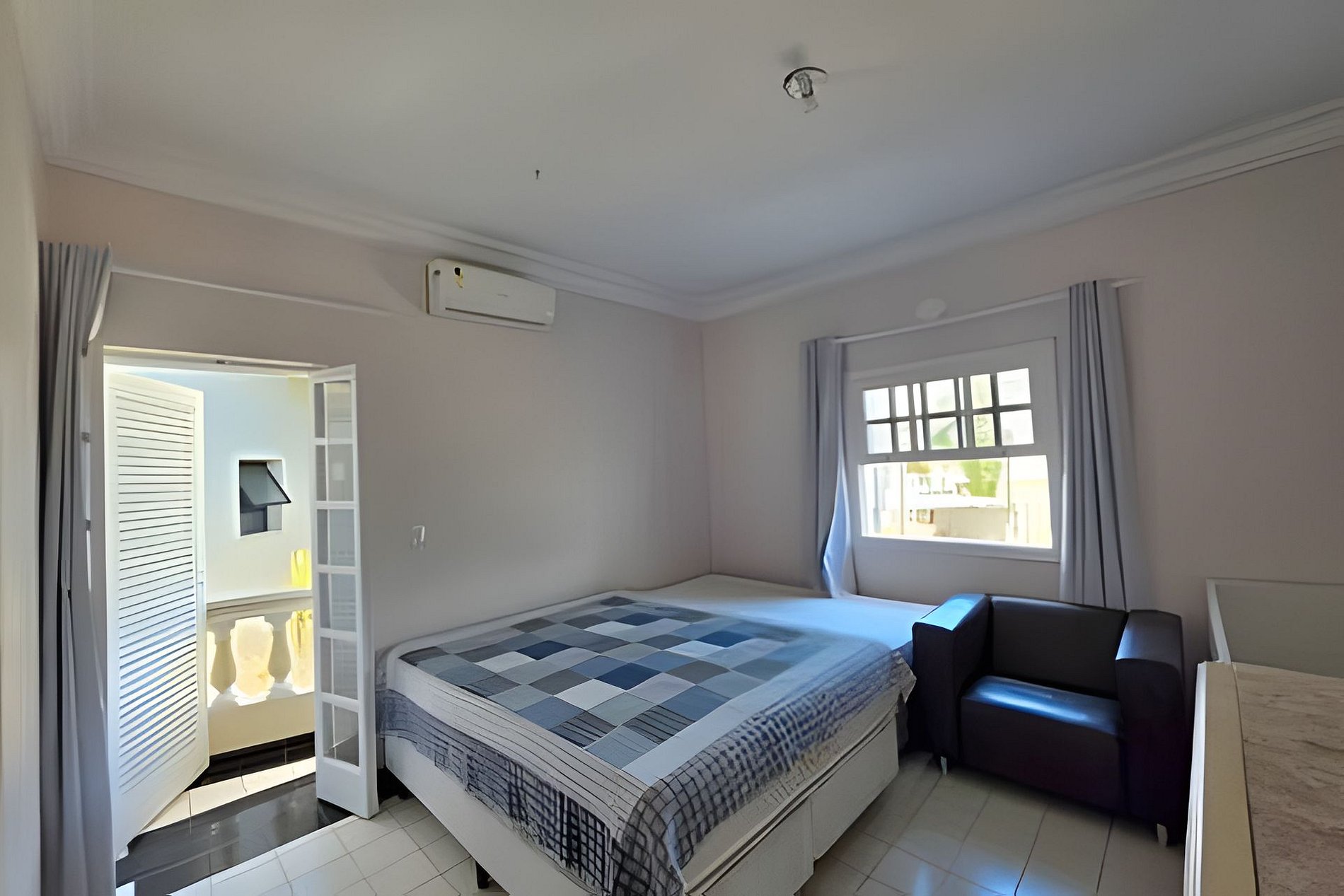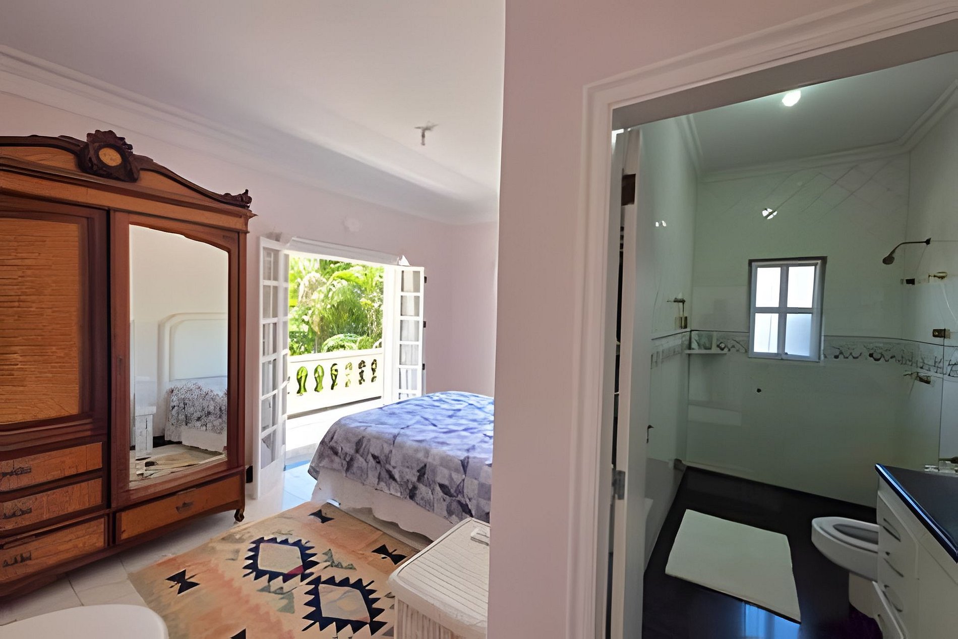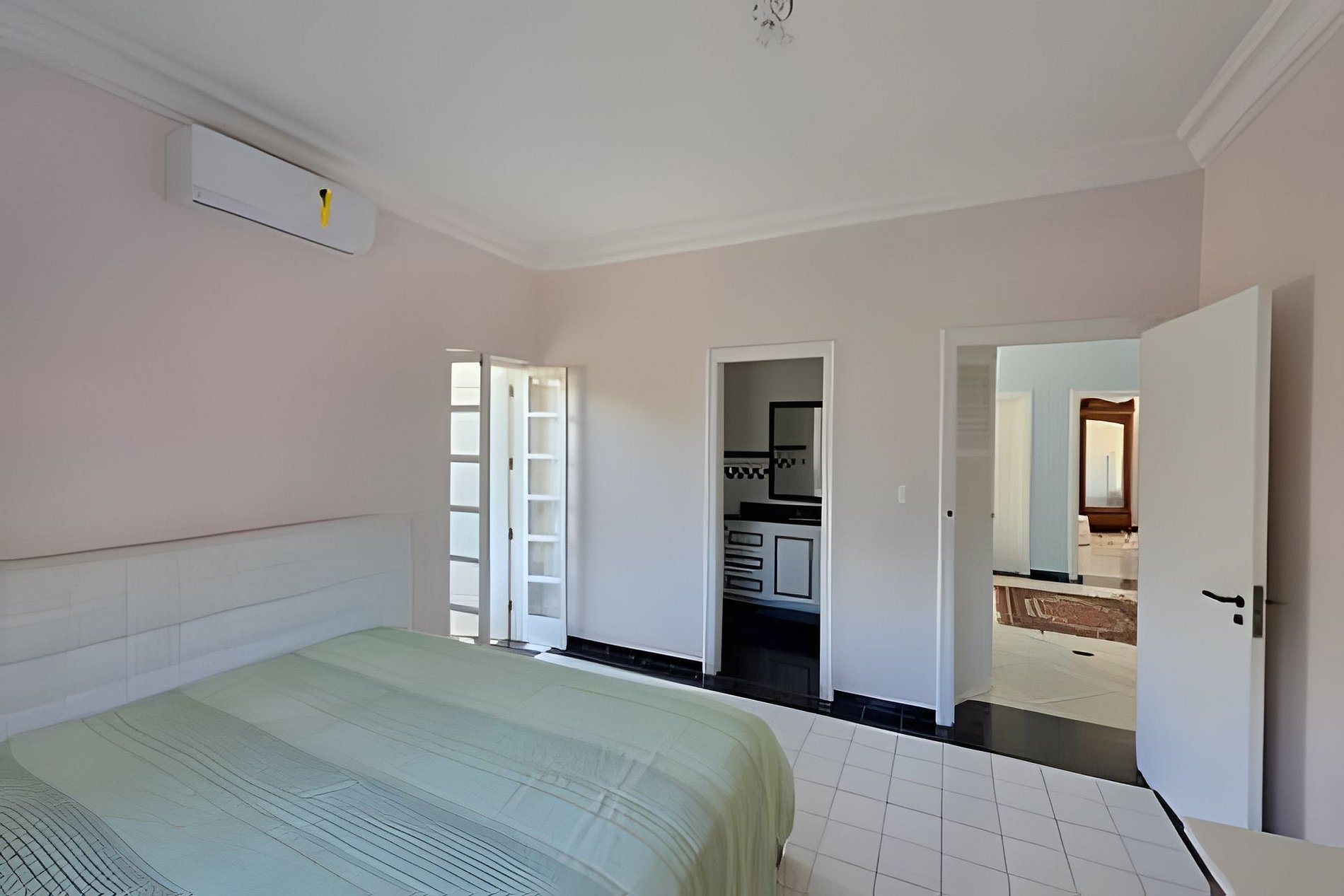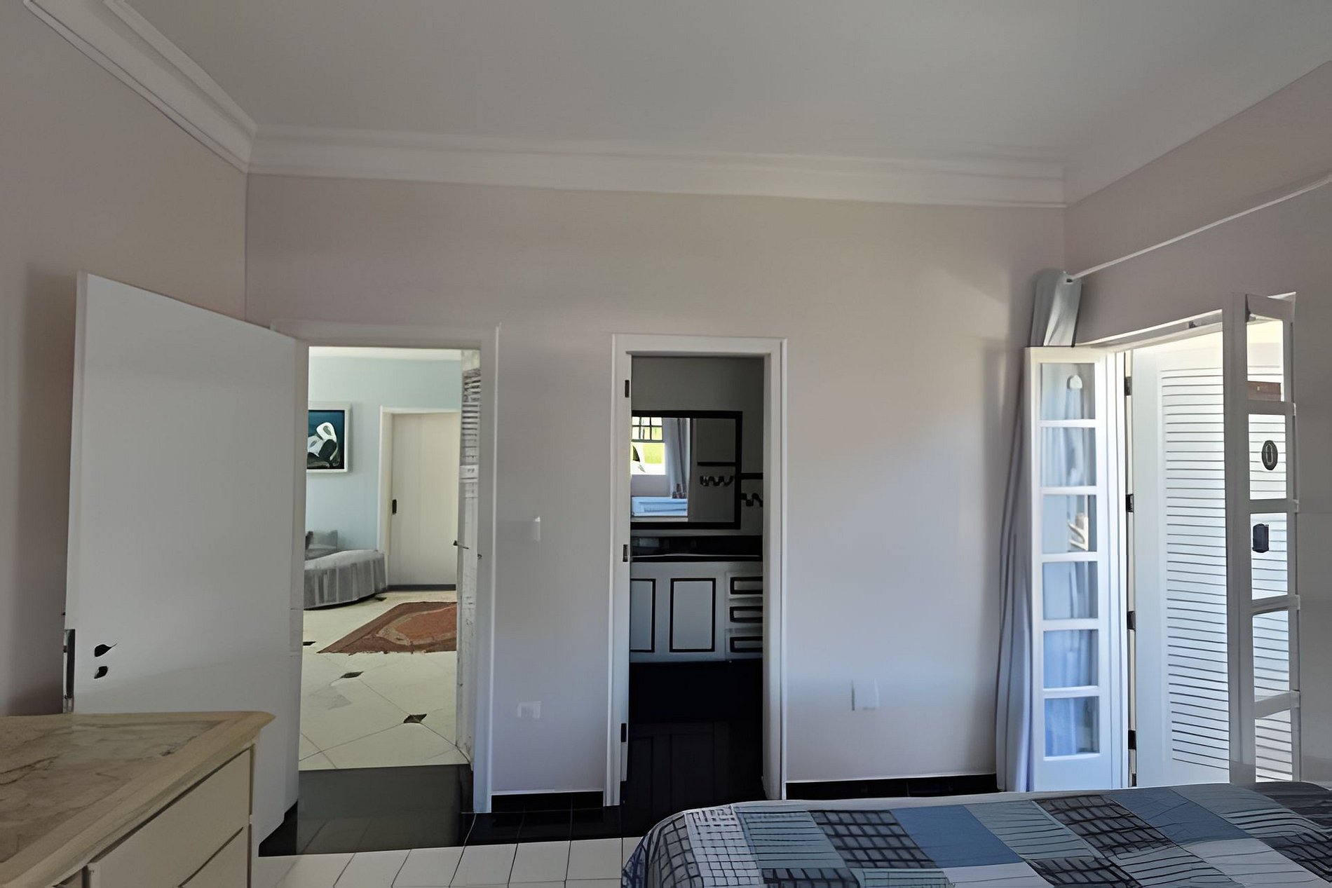 Casa com 4 suites no andar superior, 1 quarto com banheiro ao lado no andar térreo, sala com Tv 55 polegadas, sala de jantar e varanda grande com duas mesas grandes.