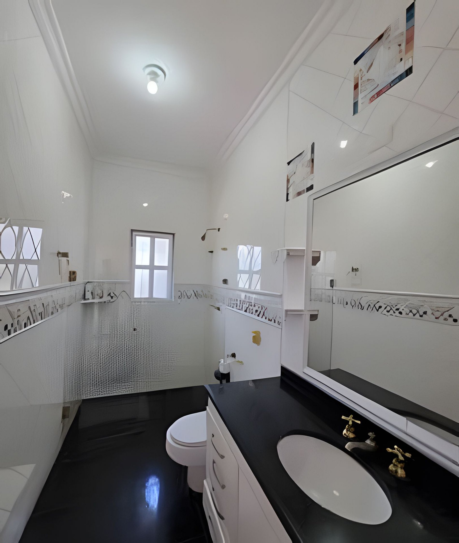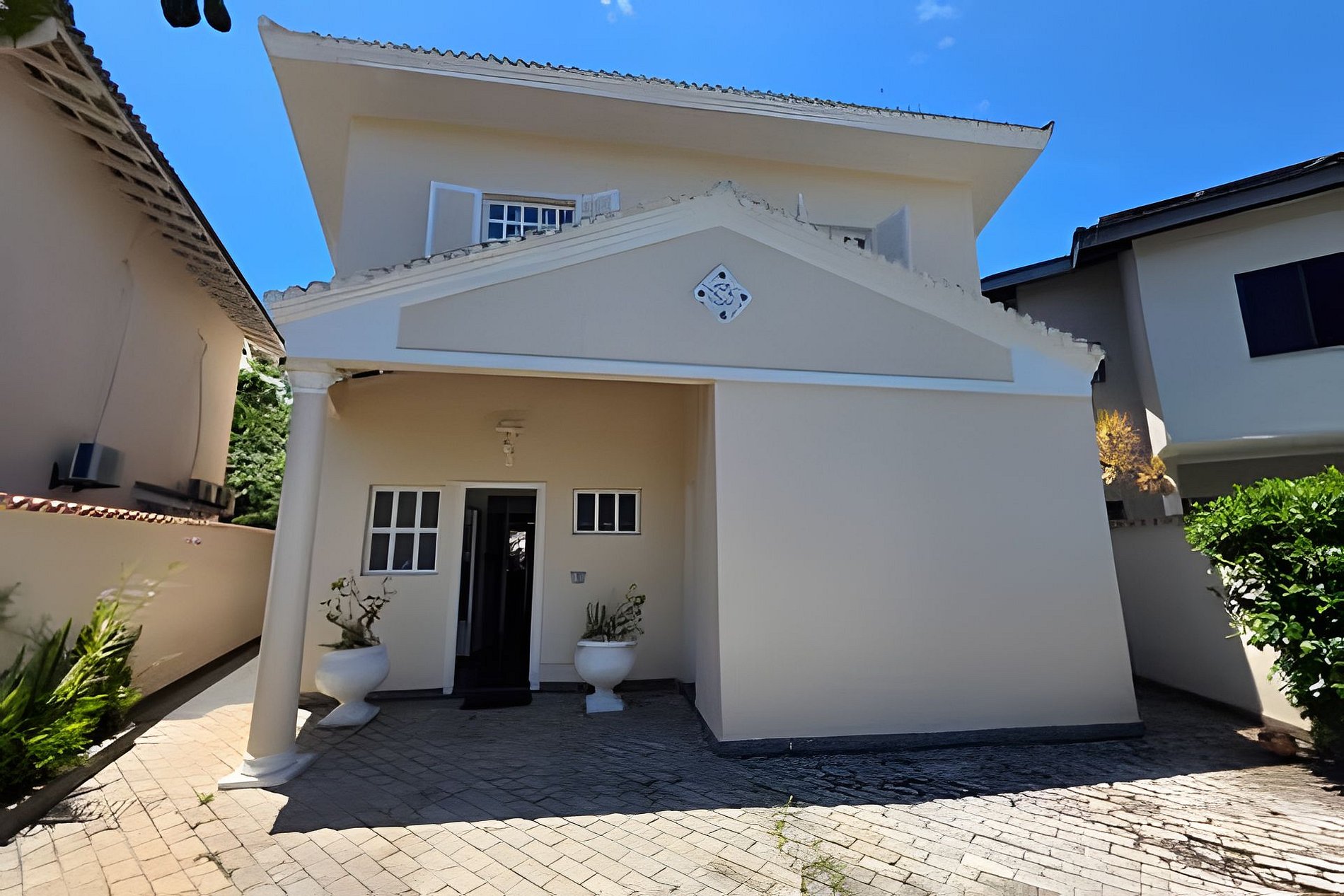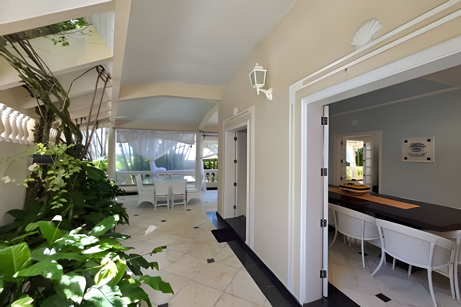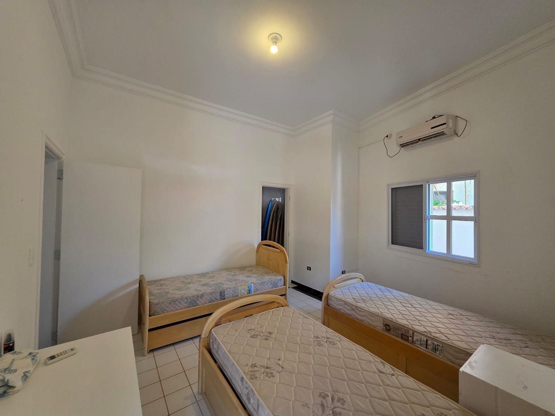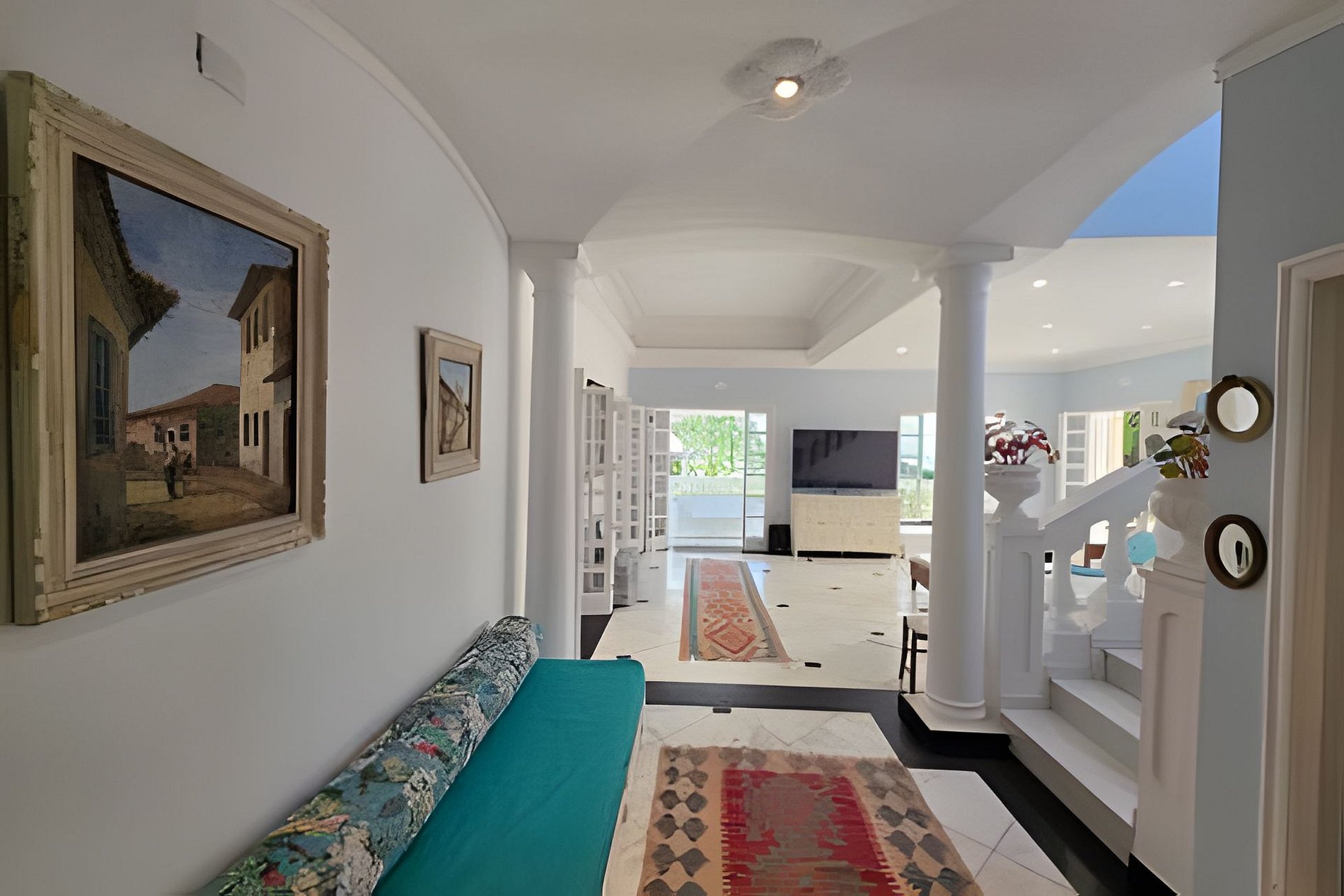 Casa com 4 suites no andar superior, 1 quarto com banheiro ao lado no andar térreo, sala com Tv 55 polegadas, sala de jantar e varanda grande com duas mesas grandes.