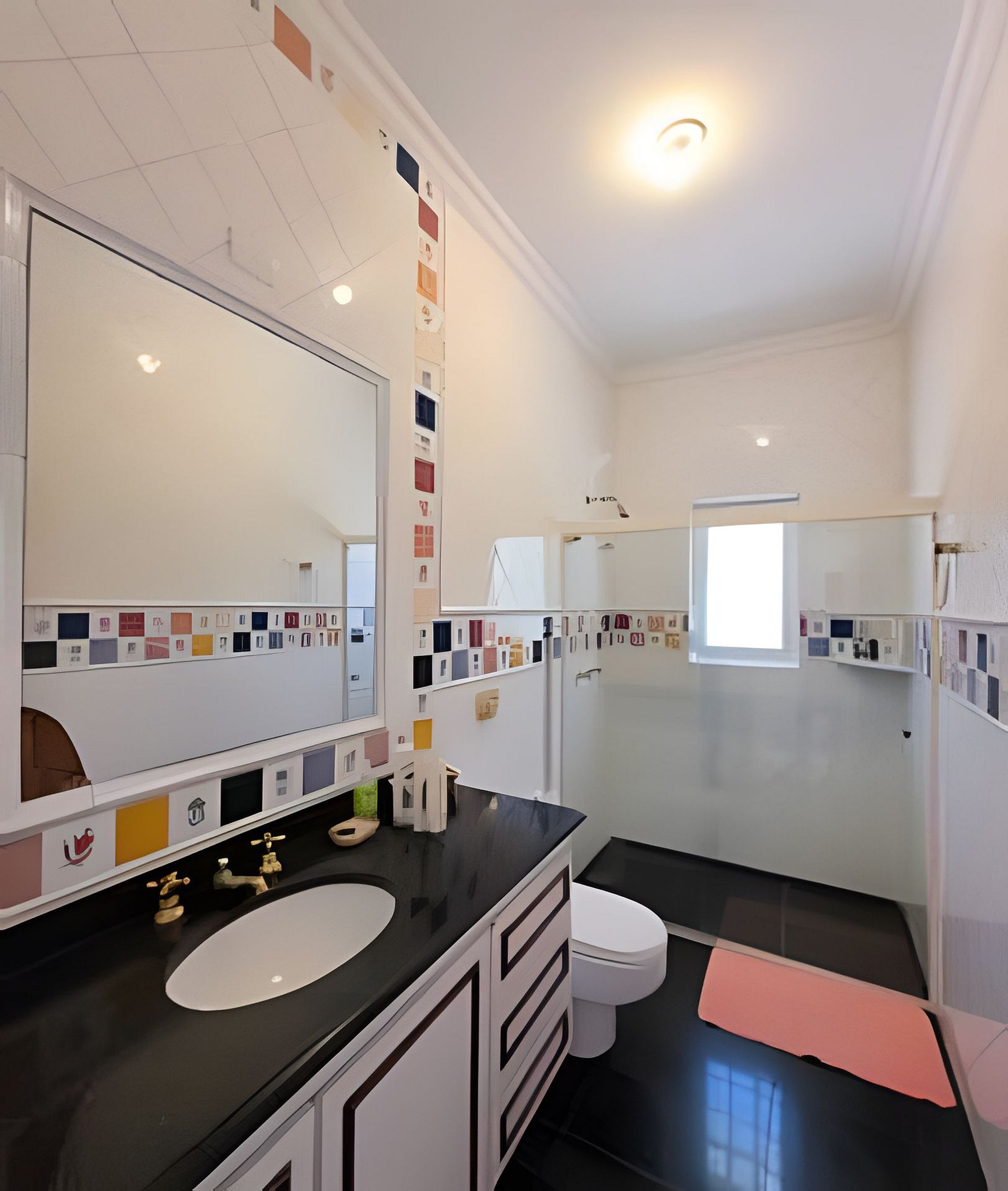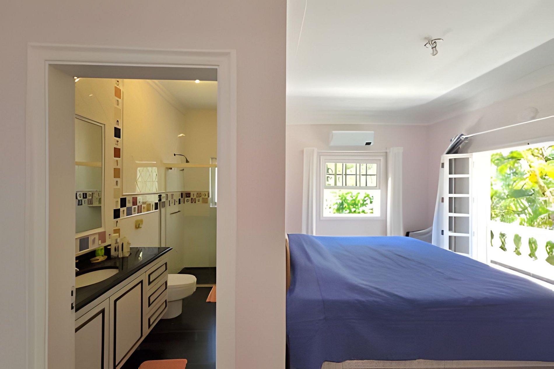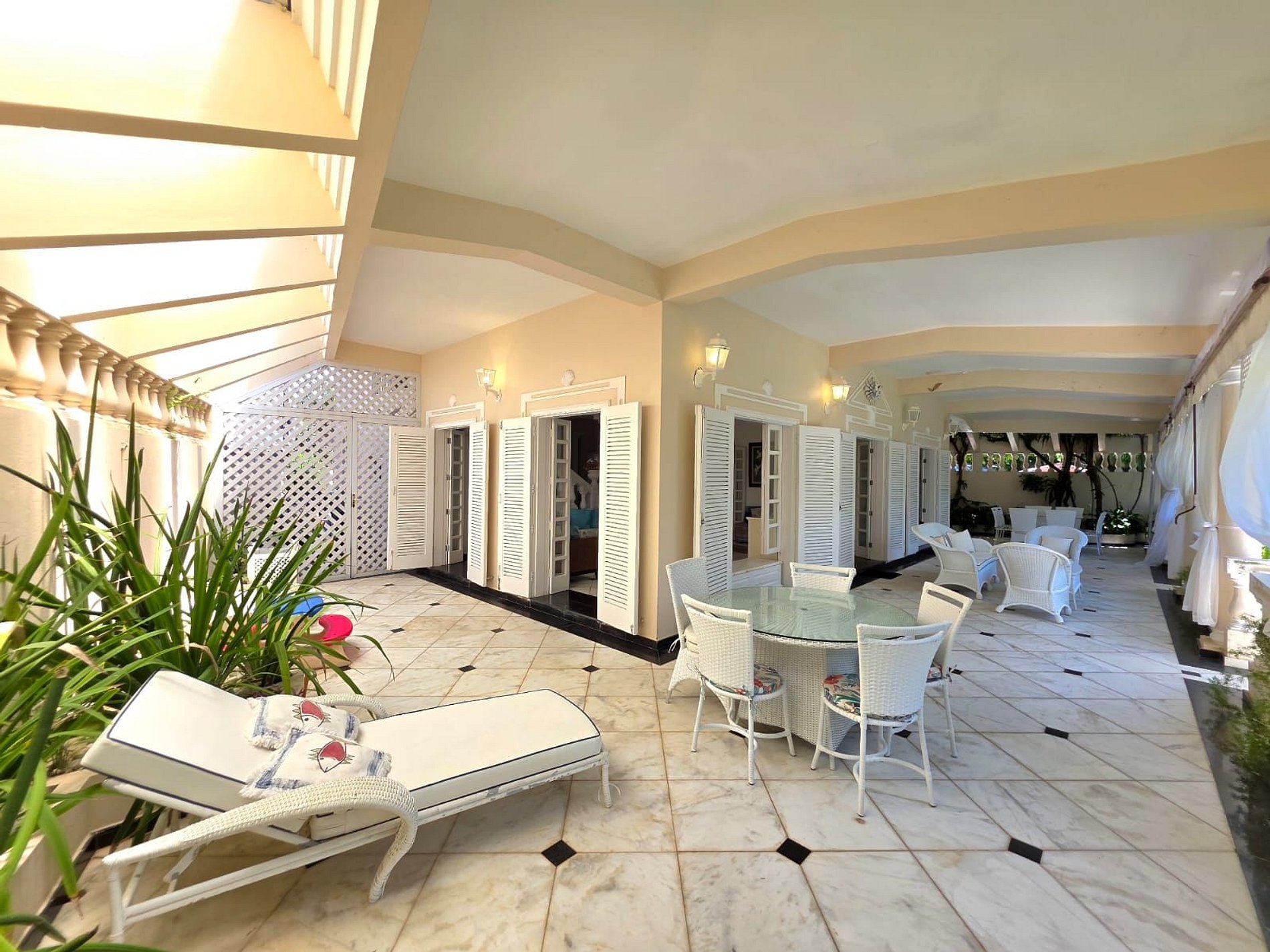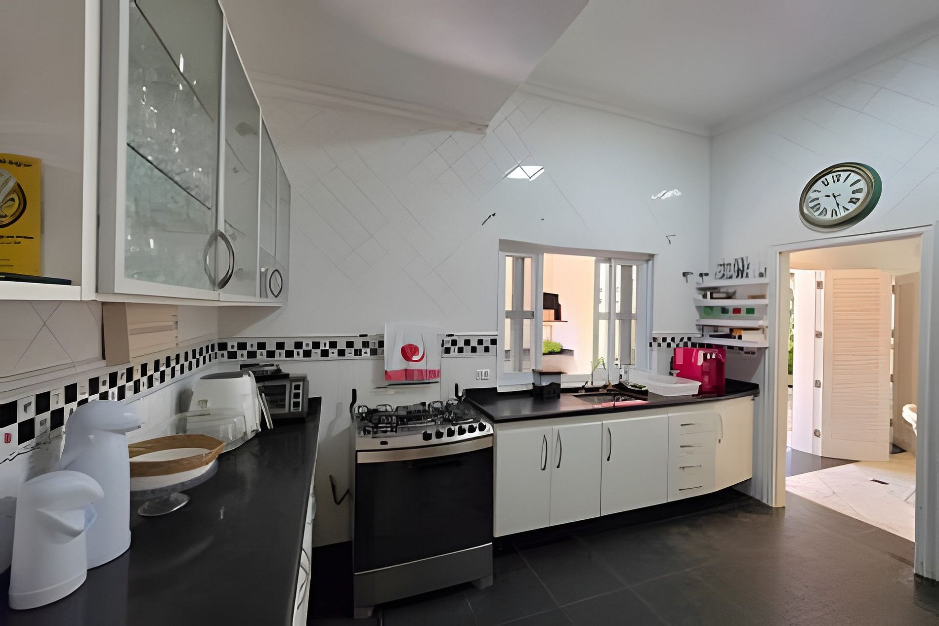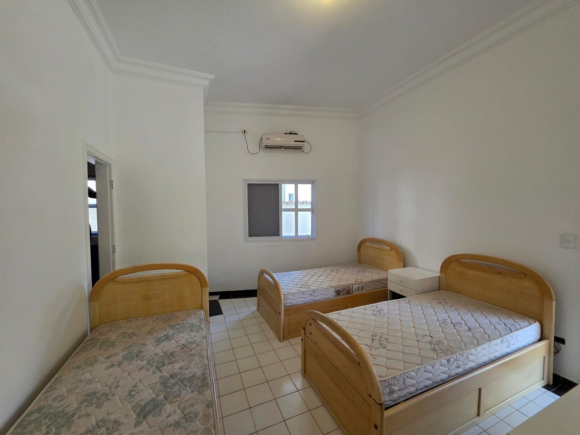 Casa com 4 suites no andar superior, 1 quarto com banheiro ao lado no andar térreo, sala com Tv 55 polegadas, sala de jantar e varanda grande com duas mesas grandes.