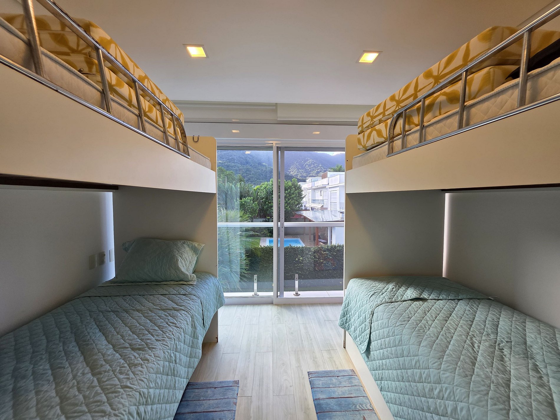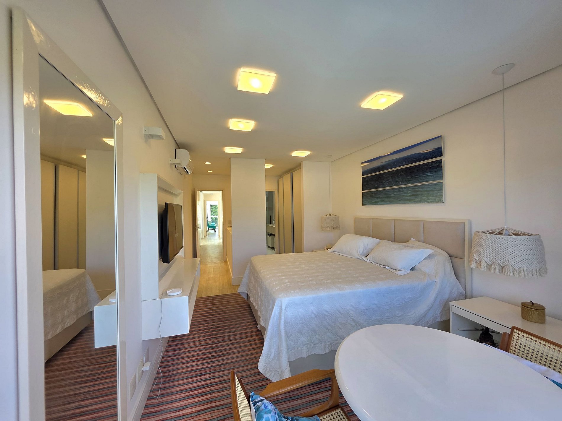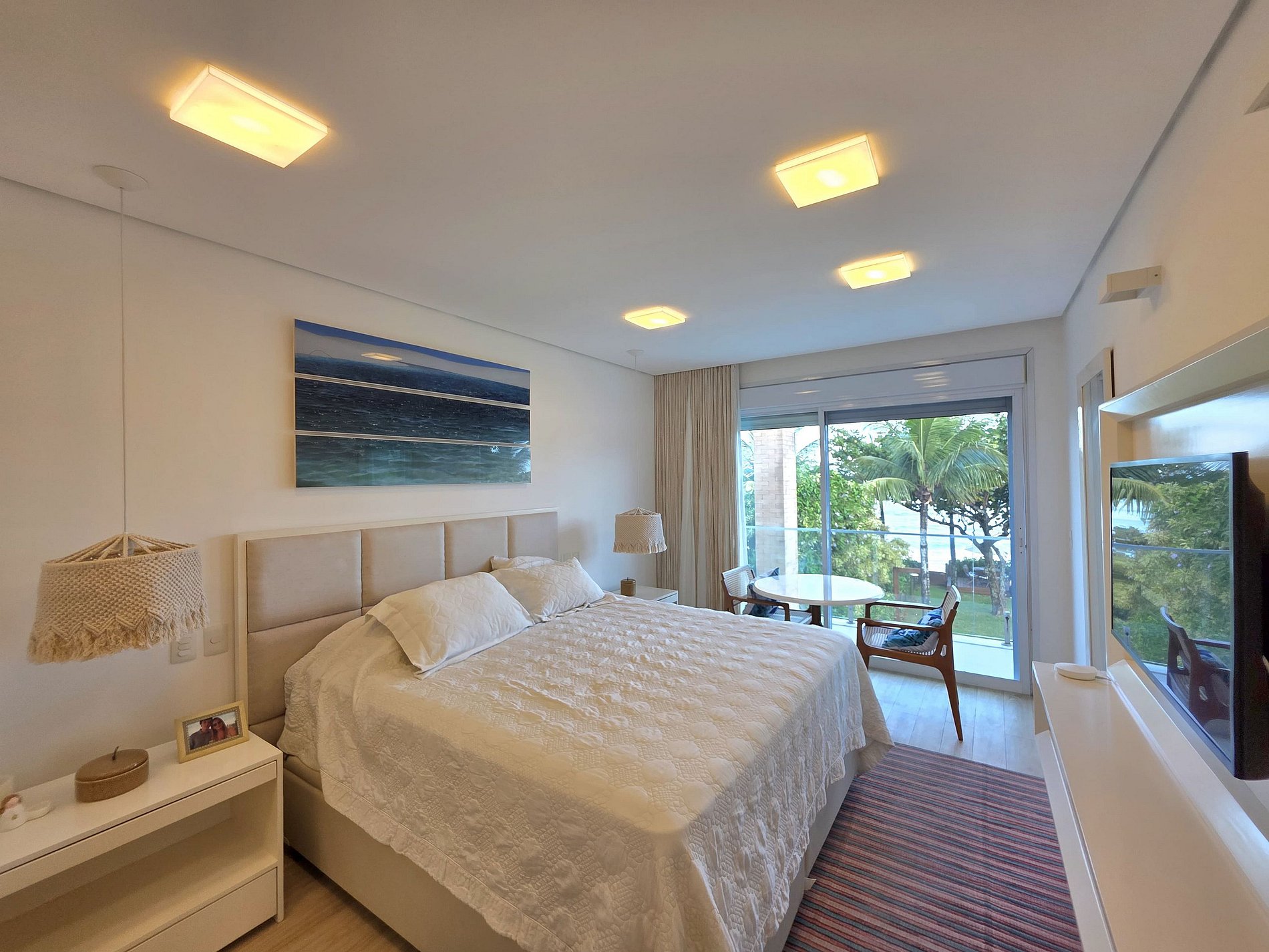São 5 Suítes espaçosas no primeiro andar, garantindo privacidade e conforto para todos. Duas delas com vista e varanda para o mar, incluindo uma suíte master luxuosa com closet e banheira. Perfeita para acomodar grupos, com opções de camas queen, solteiro e beliches (utilizamos a parte de baixo da beliche mais a bicama, pois ela é muita alta).
