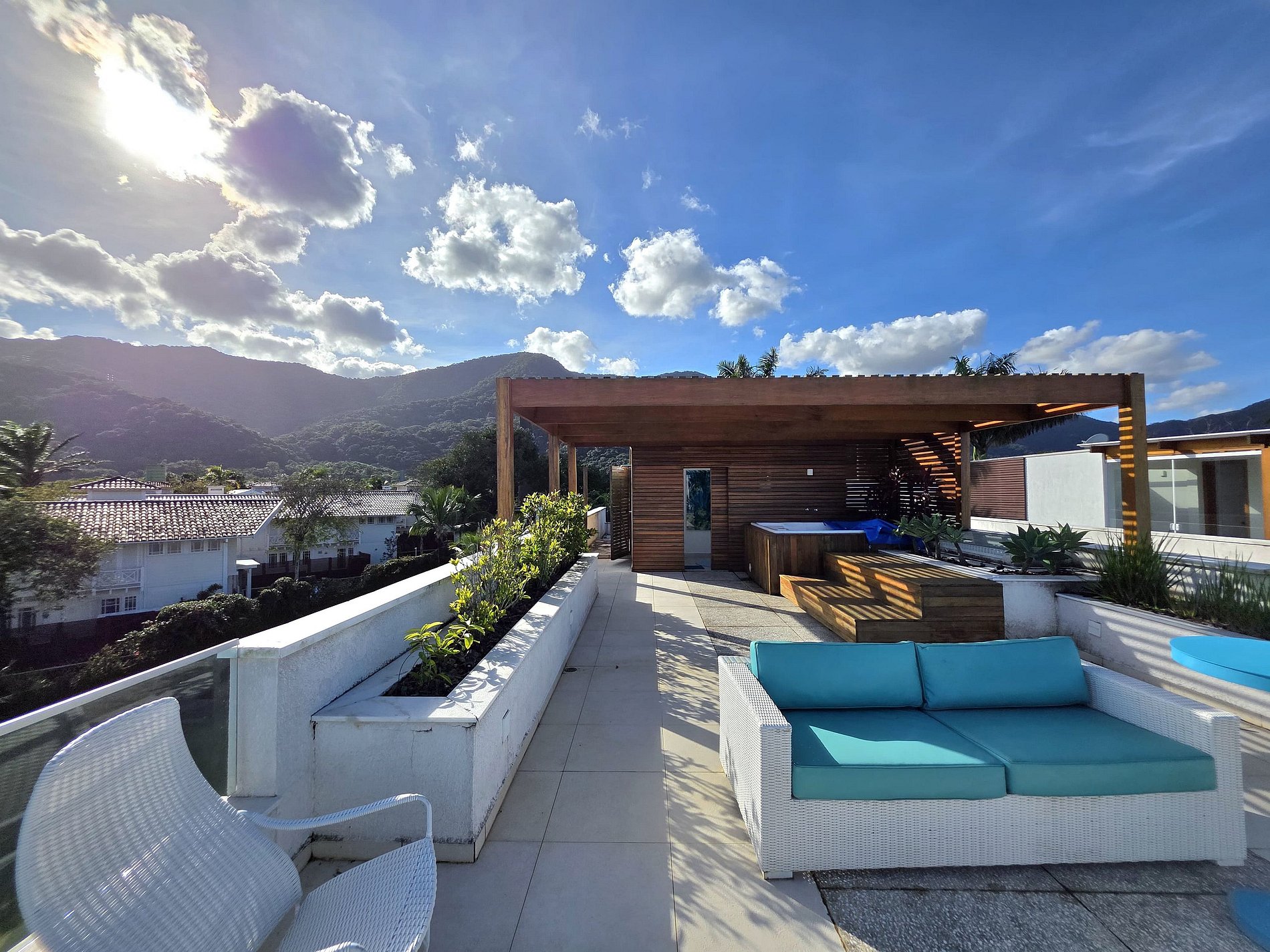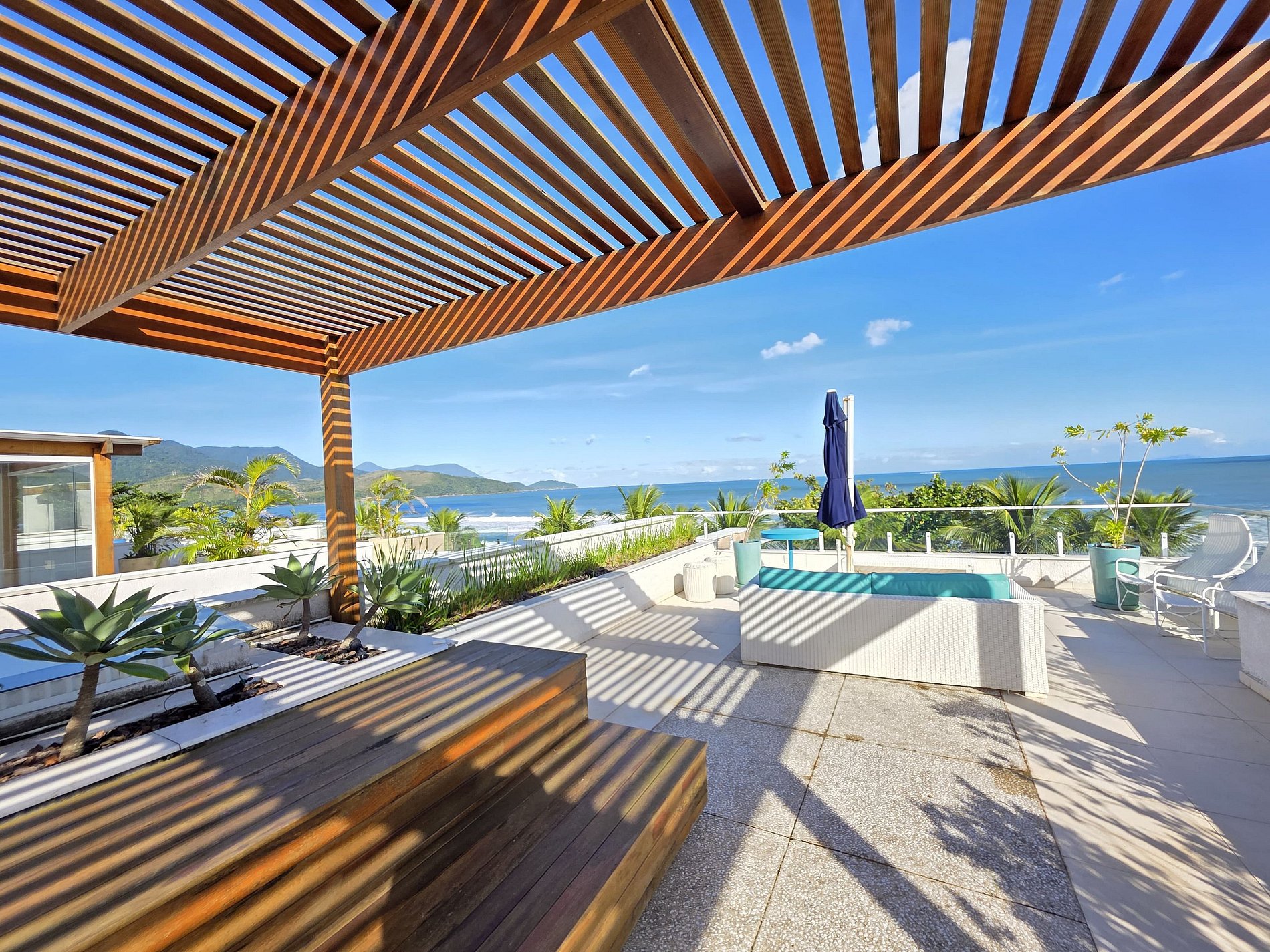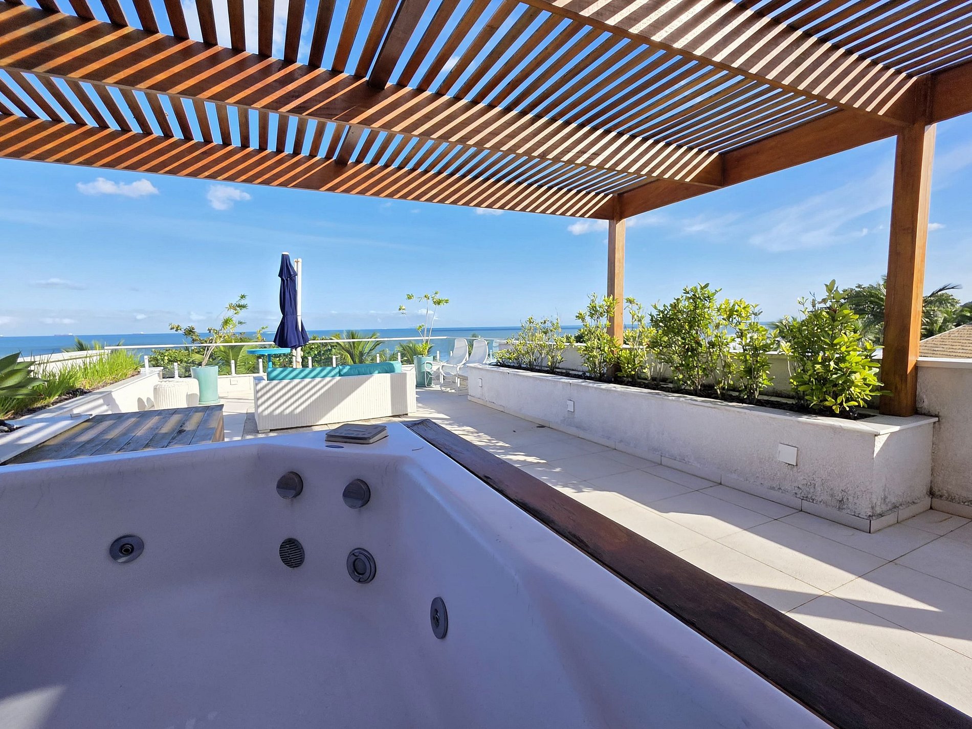 A grande surpresa no terceiro piso: Uma jacuzzi maravilhosa e uma área externa reservada com uma sala com vista privativa espetacular para toda a extensão da Praia de Maresias. O seu cantinho para contemplar o pôr do sol ou as estrelas!